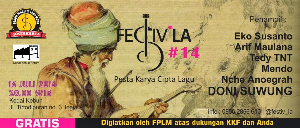 FESTIVLA edisi 14 akan digelar di Kedai Kebun, Jl, Tirtodipuran no. 3 Jogja pada Rabu, 16 Juli 2014 jam 20.00 WIB.